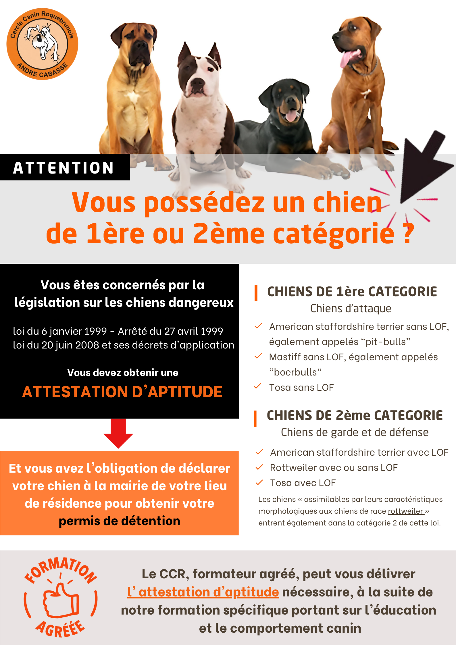 - La formation à l’obtention de l’attestation d’aptitude de chiens de catégories 1 et 2 et de tout chien mordeur a pour objectif :